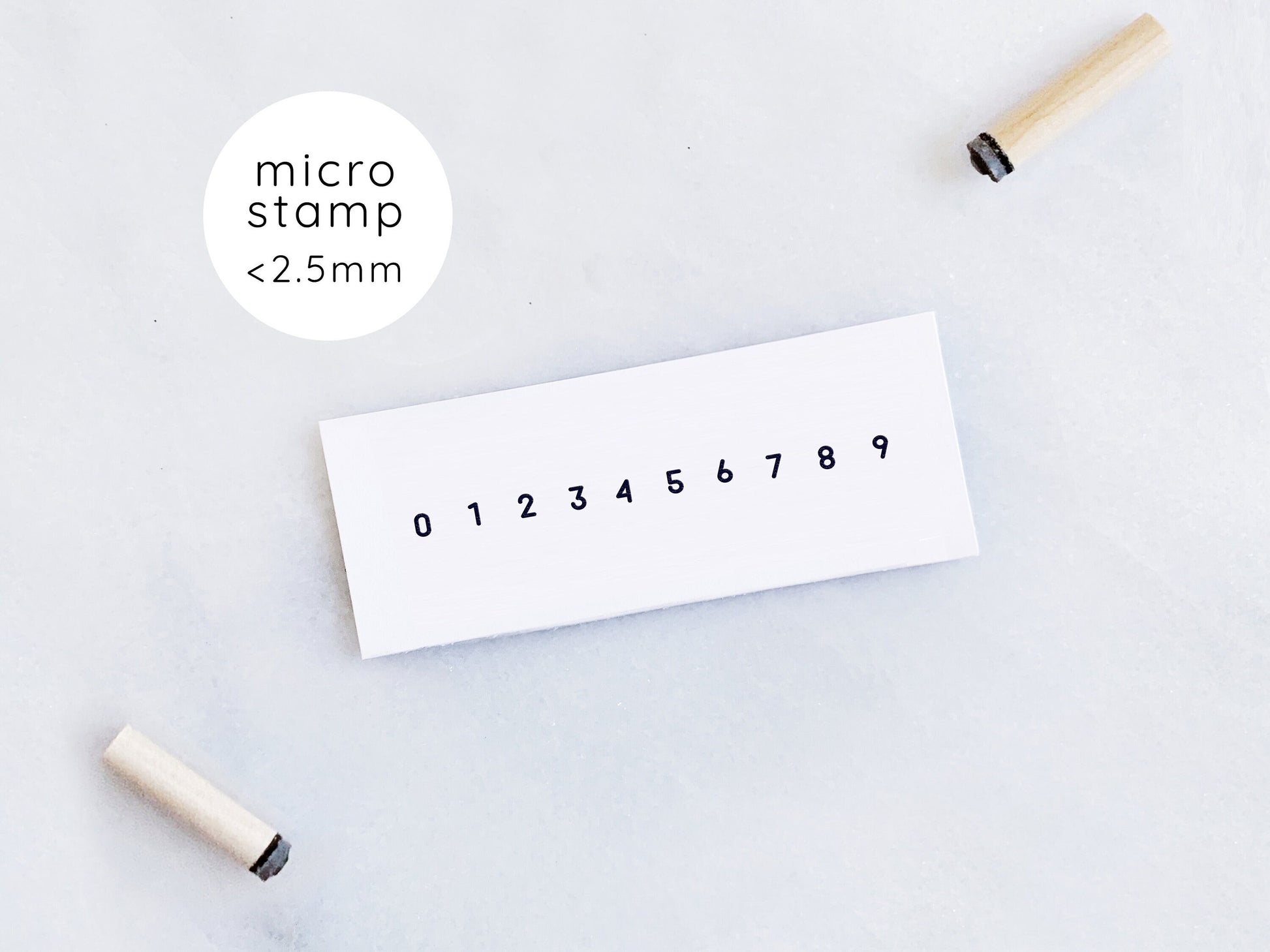 A set of ten teeny tiny micro rubber stamps of the numbers 0 through 9 in a sans serif font. Perfect for bullet journals, agendas, to do lists, stationery, notes, and envelopes.